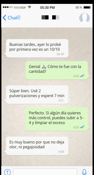 Deja pasar unos minutos entre aplicaciones para evaluar el efecto. Evita reaplicar en exceso; comienza siempre con 1–2 sprays.